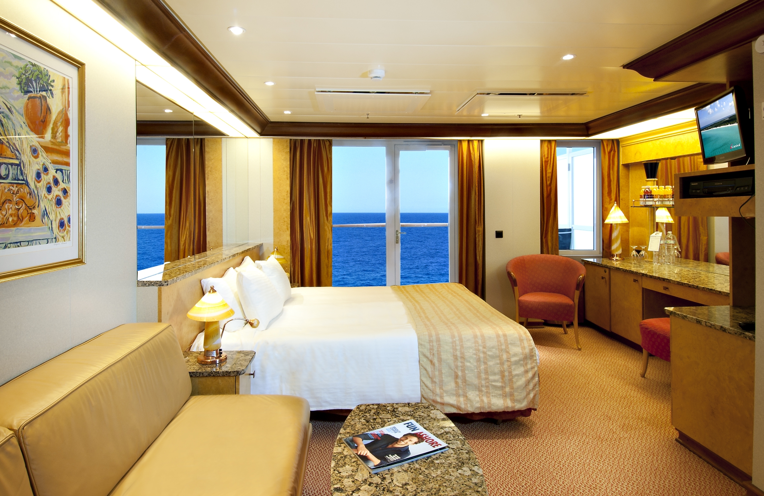 The beds shown above are twins, but rooms with Royal king beds are also available. The interior staterooms are 140 square feet.
